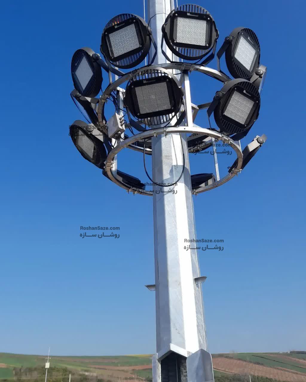 برج روشنایی 15 متری با مقطع هشت وجهی متشکل از 2 قطعه 6 متری و 1 قطعه 4 متری بصورت اتصال اورلپ؛ متریال: از فولاد ST37، نوع جوش: CO2، نوع پوشش: گالوانیزه گرم تحت استاندارد ASTM A123 با چسبندگی 80 تا 100 میکرون، دارای سبد متحرک دوطبقه جهت نصب 16 عدد پرژکتور 200 وات Led، موتور گیربکس برقی، دینام، سیم بکسل فولادی، کابل برق داخلی، میله برقگیر، چراغ آلارم چشمک زن، تابلو برق، پرژکتور و سایر لوازم جهت عملکرد صحیح برج.
