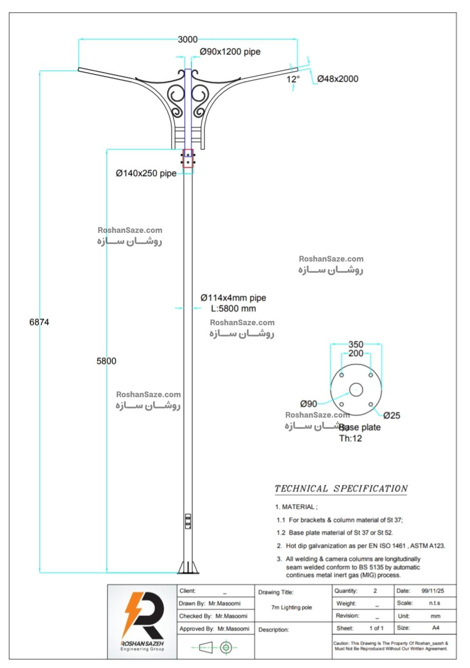 پروژه پای چراغ دکوراتیو 7 متری، به سفارش کارفرما، توسط گروه مهندسی روشان سازه، طراحی و تولید شده است.
